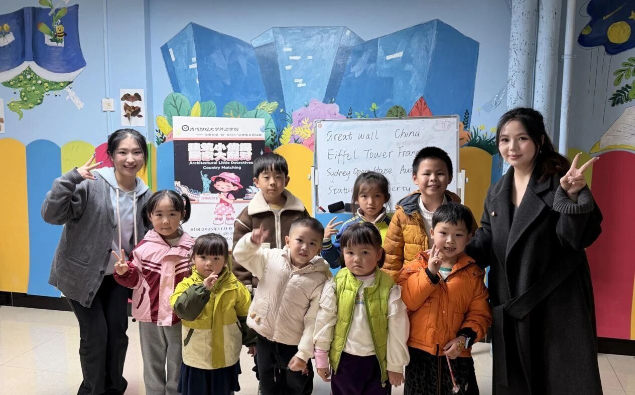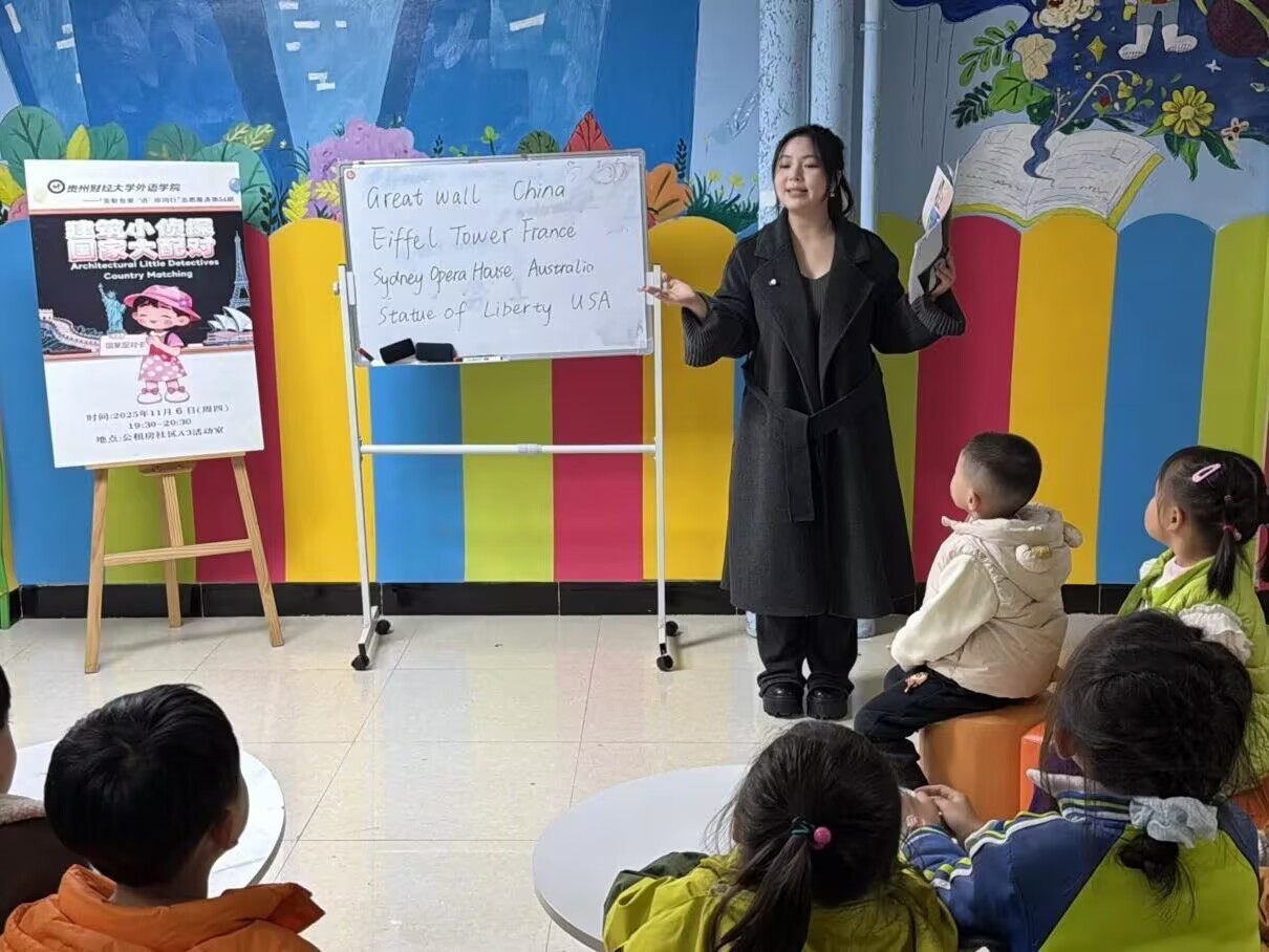 2025年11月6日19:30,外语学院“贵财有爱 ‘语’你同行”第54期志愿者姜园园、石如美、杜威威、白柯瑞,在西校区公租房社区A3活动室带来“建筑小侦探,国家大配对”主题教学,用趣味游戏与文化小故事,为小朋友打造了一场寓教于乐的英语探索课。