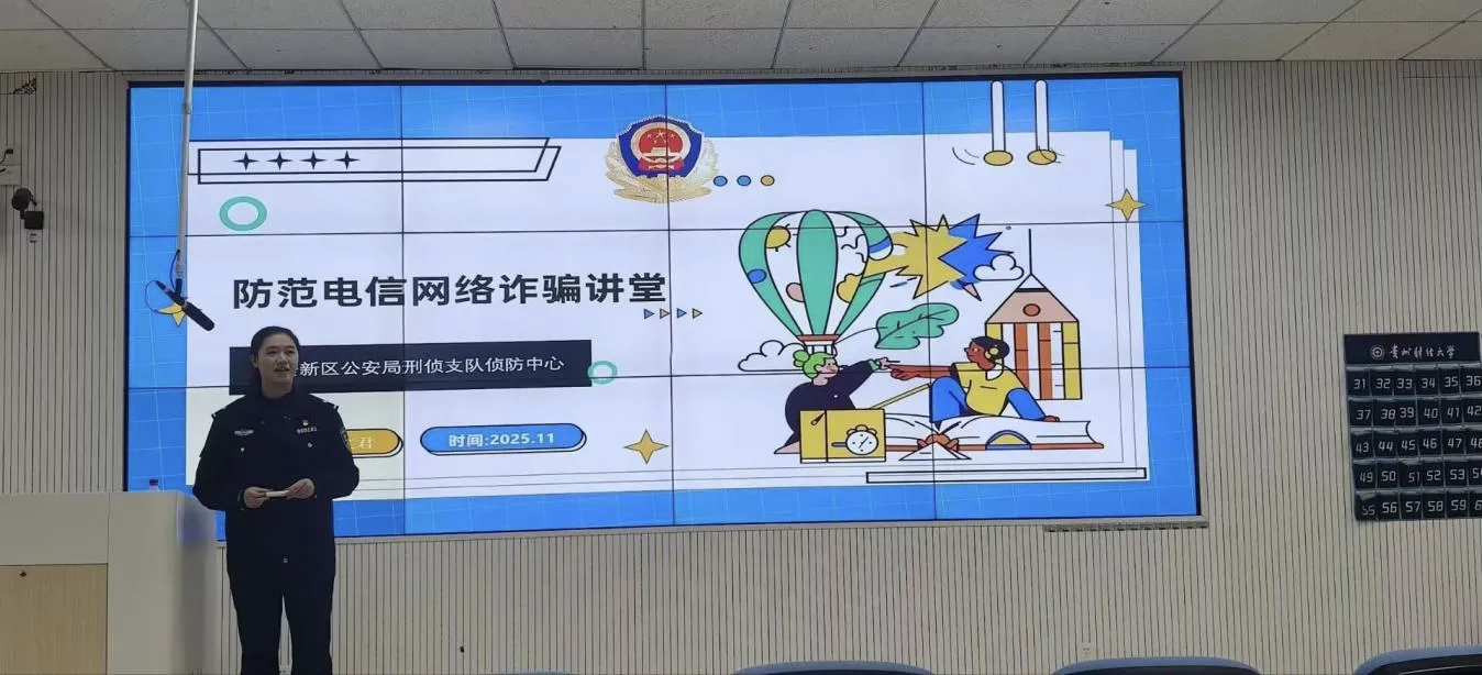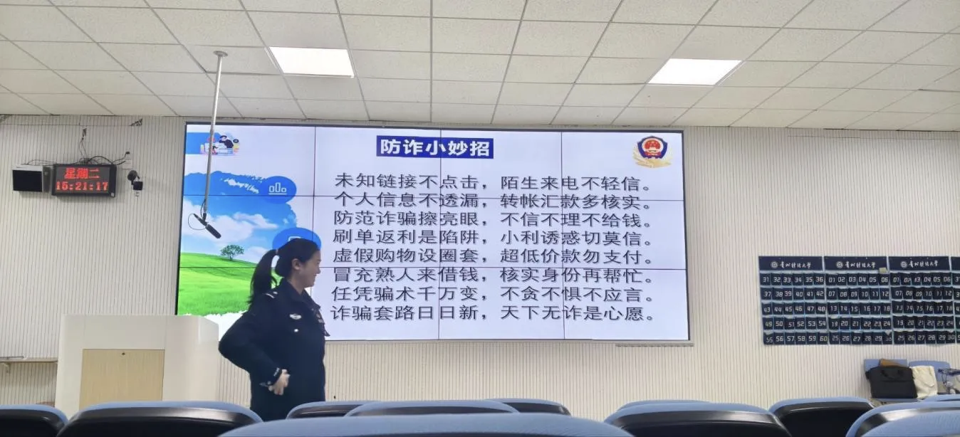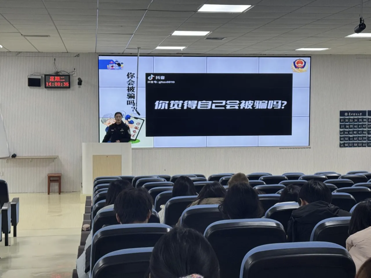 为切实提升学生防范电信网络诈骗的意识和能力,筑牢校园安全防线。11月18日下午,外语学院在乐学楼102教室组织开展“防范电信网络诈骗”专题宣讲,本次宣讲会邀请贵安新区公安局王文君警官担任主讲,宣讲会分两个场次开展,外语学院全体学生全员参与,共同学习反诈知识。