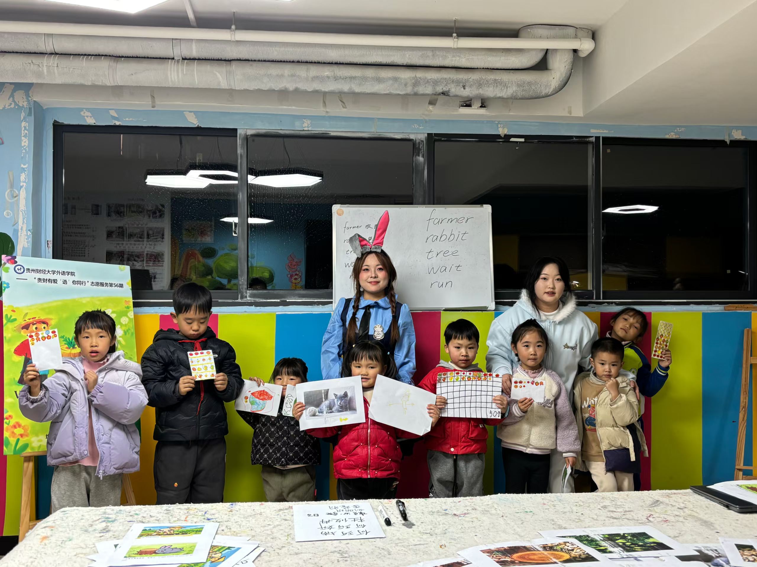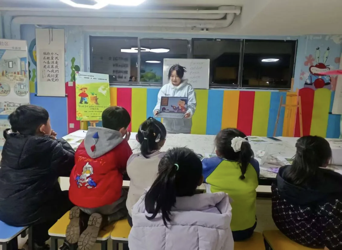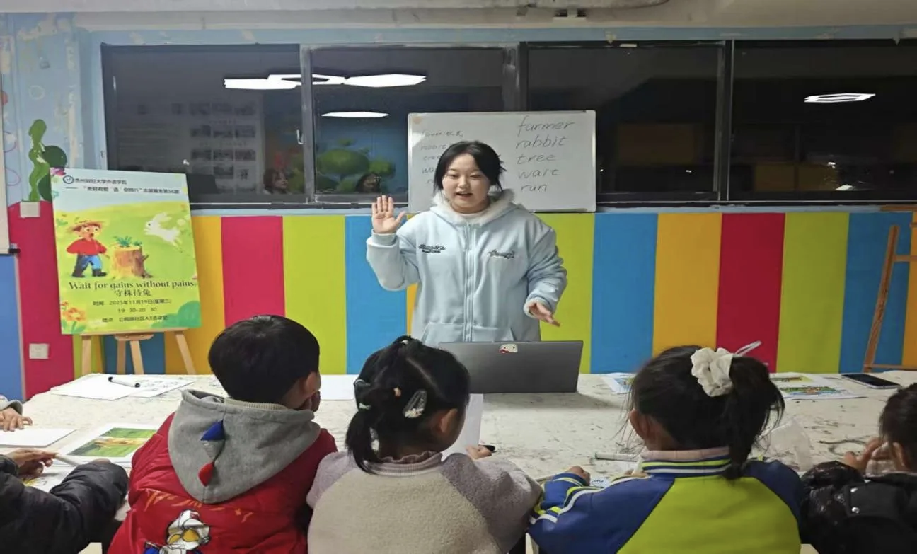 2025年11月19日19:30,外语学院“贵财有爱‘语’你同行第56期活动在贵州财经大学西校区公租房社区A1活动室顺利开展。志愿者王承菊、冯周、陈光艳、刘汉燊共同为小朋友们带来了一堂别开生面的英语趣味课堂。本期活动以“Wait for gains without pains”(《守株待兔》)为主题,巧妙地将经典寓言与趣味游戏相融合,让孩子们在亲身体验中读懂寓言内涵,在快乐互动中感受英语魅力。
