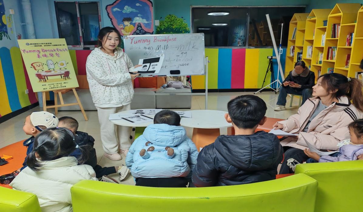 2025年11月26日19:30,外语学院“贵财有爱 ‘语’你同行”第57期活动在贵州财经大学西校区公租房社区A3活动室温馨开启。志愿者高淼、张田田、黄倩为小朋友们带来了一场以“Yummy Breakfast(美味早餐)”为主题的英语趣味课堂。活动通过儿歌律动、实物互动、趣味游戏等形式,让孩子们在欢乐中学习早餐相关英语词汇,感受英语表达的乐趣。