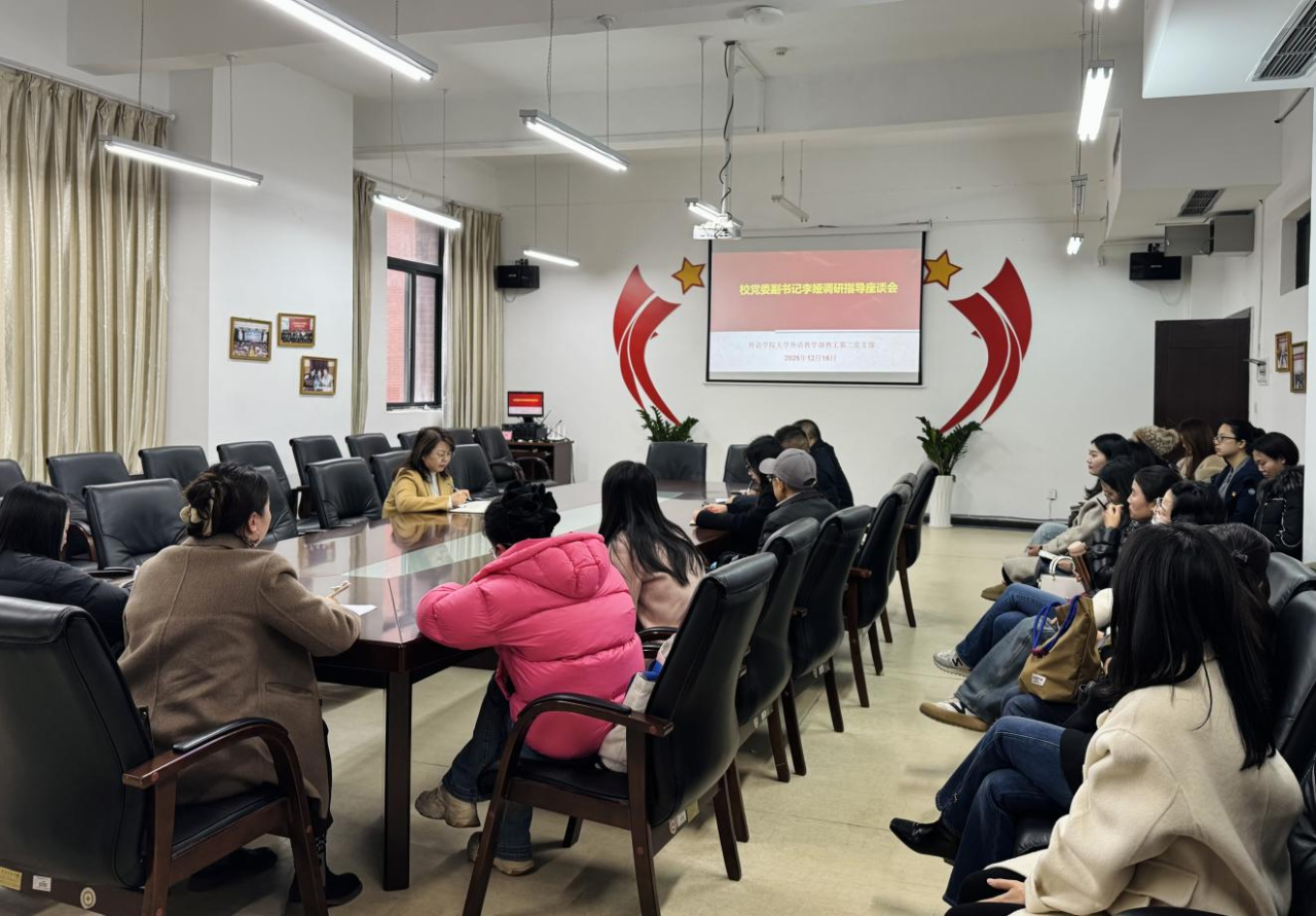 李娅指出,当前我们正深处一个波澜壮阔的伟大时代,新时代的发展和变革对教书育人和外语教学都提出了新要求。针对老师们反馈的职称晋升难点与痛点,已联系学校人事处,邀请相关负责同志到外语学院开展专题辅导讲座,切实解决老师们关切的“急难愁盼”问题,为老师们的发展提供有利帮助。