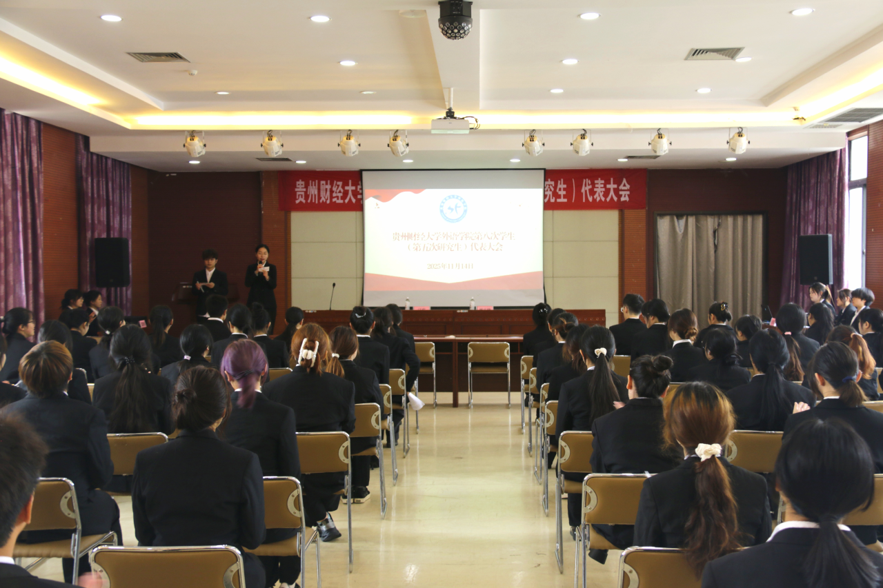 2025年11月14日,贵州财经大学外语学院第八次学生(第五次研究生)代表大会在励学楼401会议室召开,贵州财经大学团委书记杨兆瑞、外语学院党委副书记汪欢出席大会,外语学院63名学生代表参加大会。