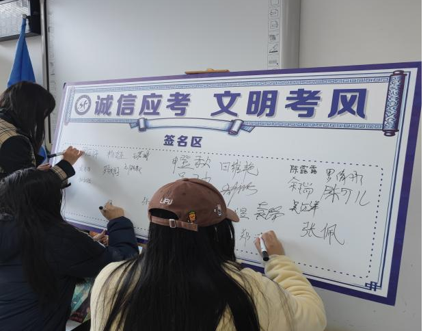 为强化教育实效、推动诚信意识内化于心、外化于行,班会上组织全体同学郑重签署了《外语学院诚信考试承诺书》。部分学生代表还主动在“诚信应考 文明考风”宣传板上签名,表达自觉维护考试纪律、共同营造健康学风的决心。