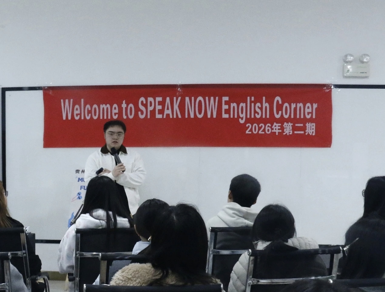 活动开场,主持人以全英文热情问候在场同学,分享了音乐与英语结合的趣味之处,随后介绍了活动流程与奖励规则 —— 每轮游戏获胜者可获得小奖品,累计获奖最多者将获评“英语角之星”。