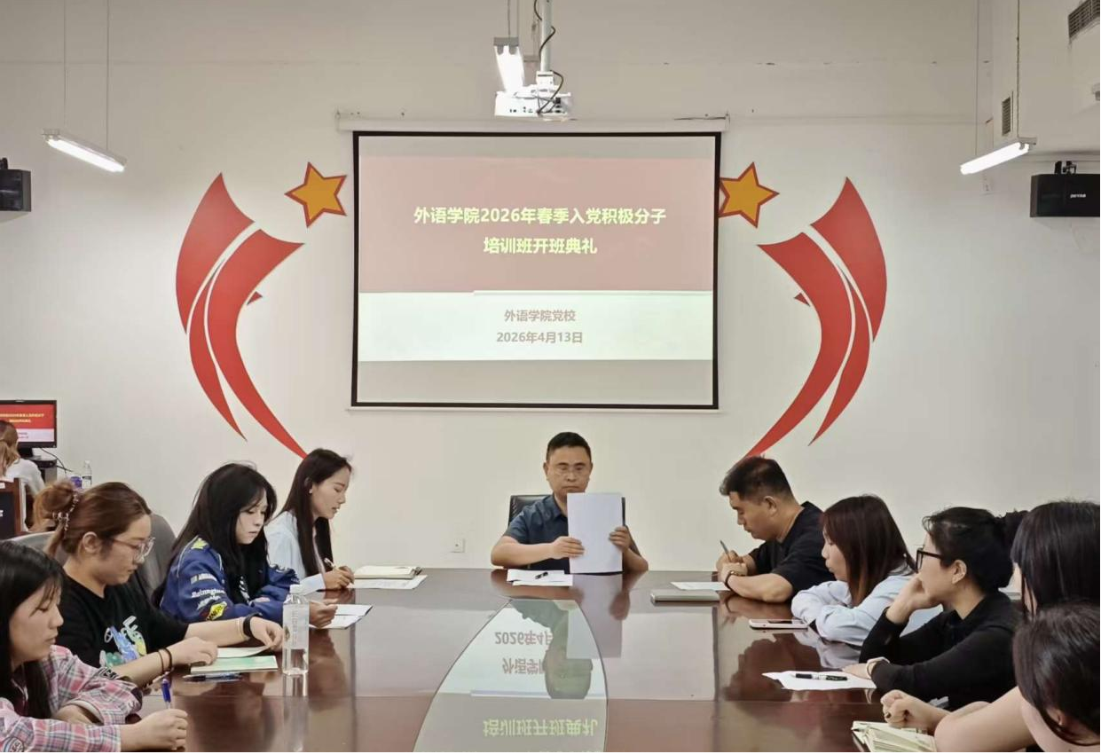 4月13日中午,外语学院2026年春季入党积极分子培训班开班典礼暨第一课在励学楼301会议室举行。外语学院党委书记黄贵平、外语学院本科生第一党支部书记刘鹏程出席,培训班全体学员参加,典礼由学院学生党建工作中心主任朱蕊主持。