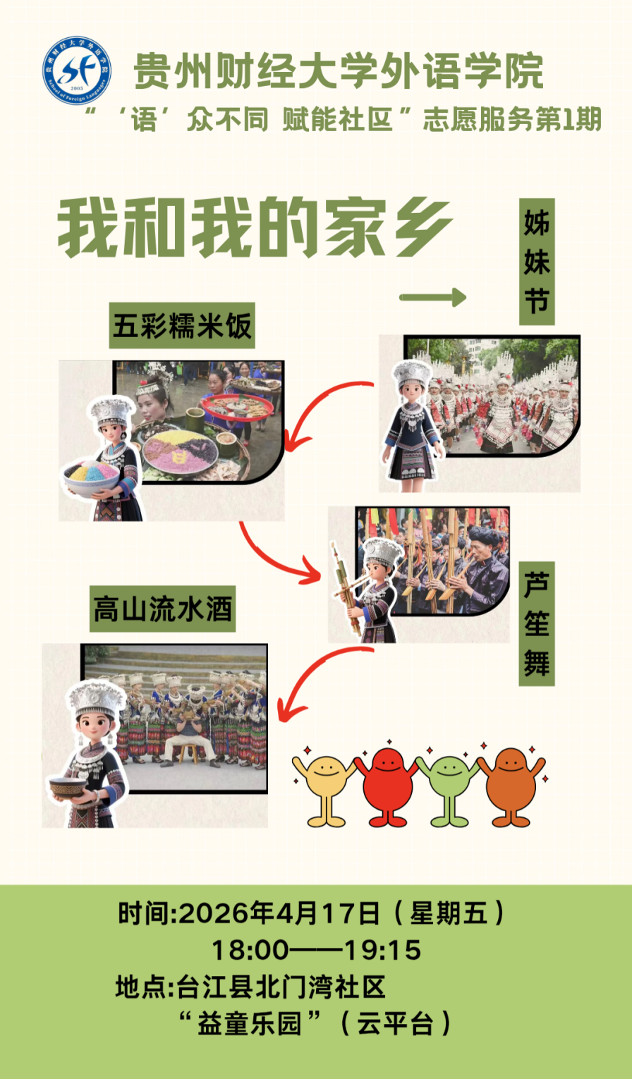 “‘语’众不同 赋能社区”志愿服务第1期重磅开启!本次活动以My People, My Homeland为主题,走进台江,带领孩子们沉浸式探秘苗族文化世界。在趣味英语学习中感受家乡温情,在互动游戏里传承民族非遗文化,一场融合节日风情、民俗习俗、特色美食与家国情怀的双语文化之旅,即将温暖启程!