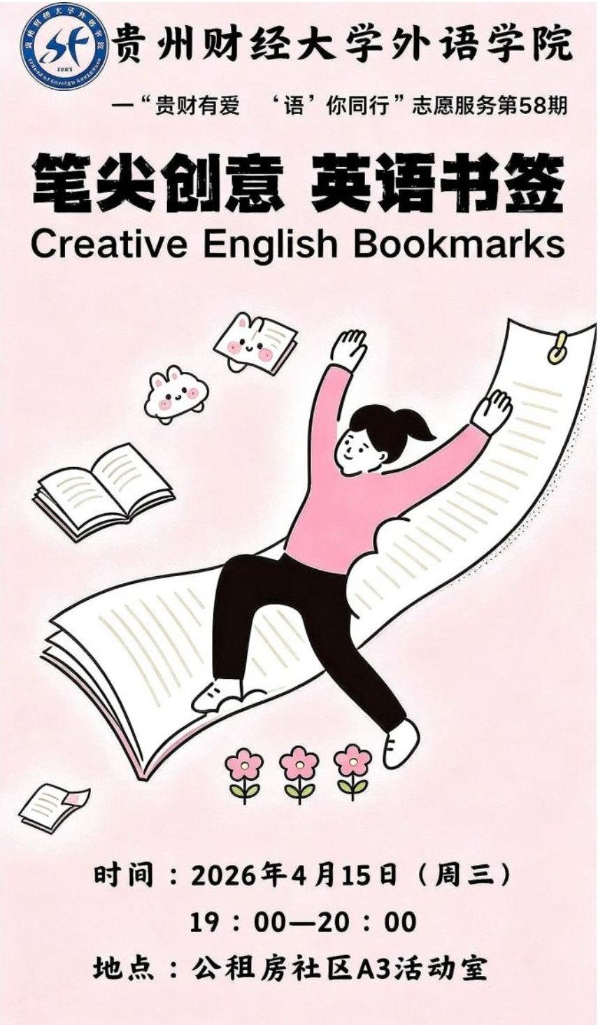 “贵财有爱‘语’你同行”志愿服务第58期志愿服务活动来啦!本期以"Creative English Bookmarks"为主题,用“手工 +英语”的趣味形式,带孩子变身“小小书签设计师”。在这里,不仅有猜谜语的头脑风暴,还有炸弹单词的惊喜欢呼,一场好玩又好学的语言启蒙之旅,等你来赴约!