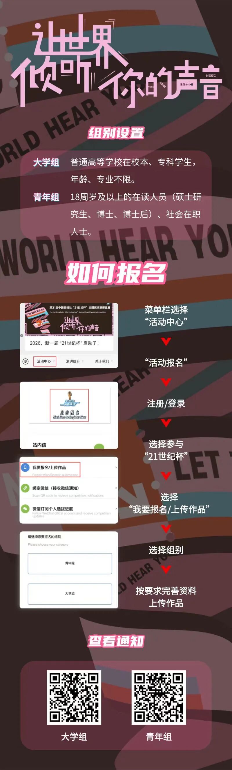 1.演讲主题:Setbacks are one’s greatest guarantee of success(挫折是成功最大的保障)。选手可围绕主题自拟题目,内容积极向上,鼓励结合中国故事、个人经历与文化思考。