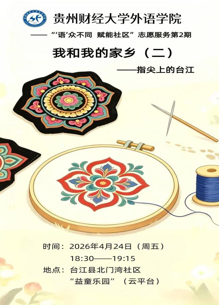 “‘语’众不同 赋能社区”志愿服务第2期来啦!本期将以“指尖上的台江”为主题,带小朋友们走进苗绣的纹样世界,从“蝴蝶妈妈”的创世神话,到一针一线里的信仰与梦想。