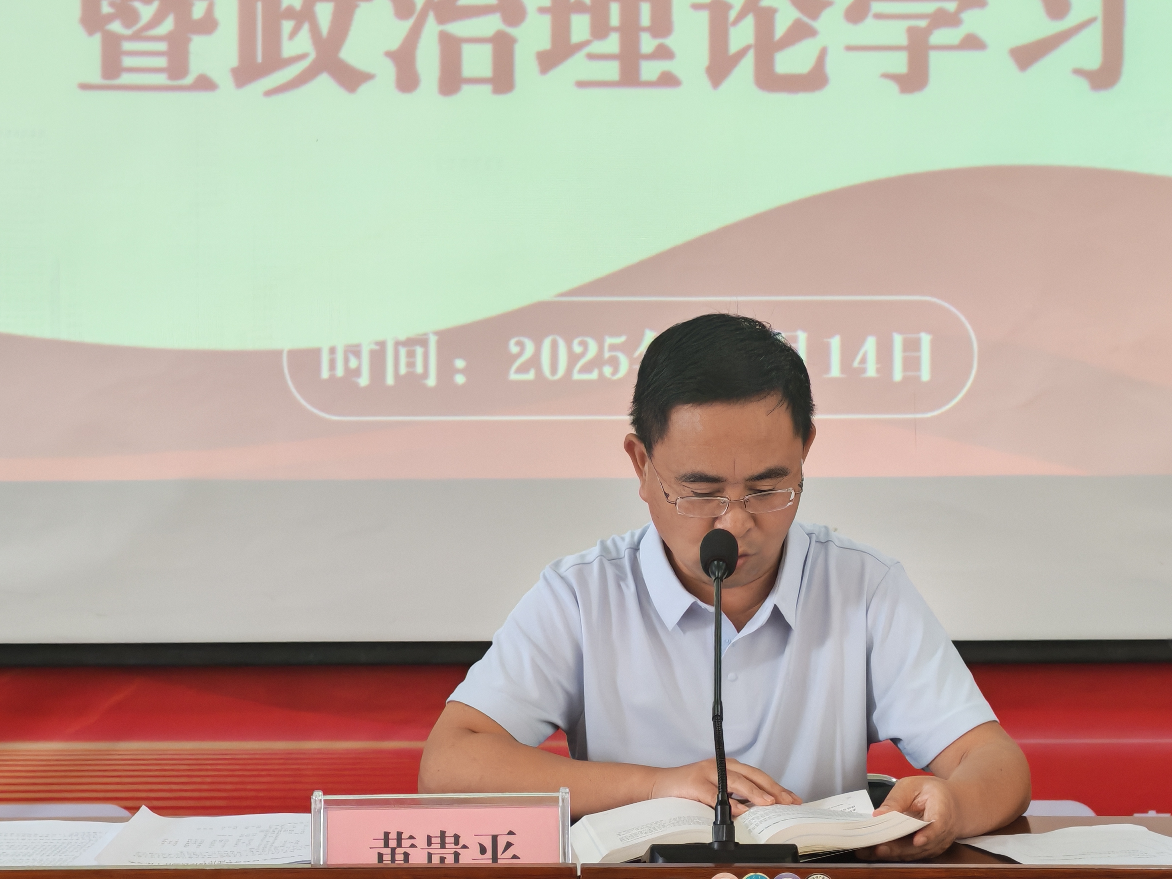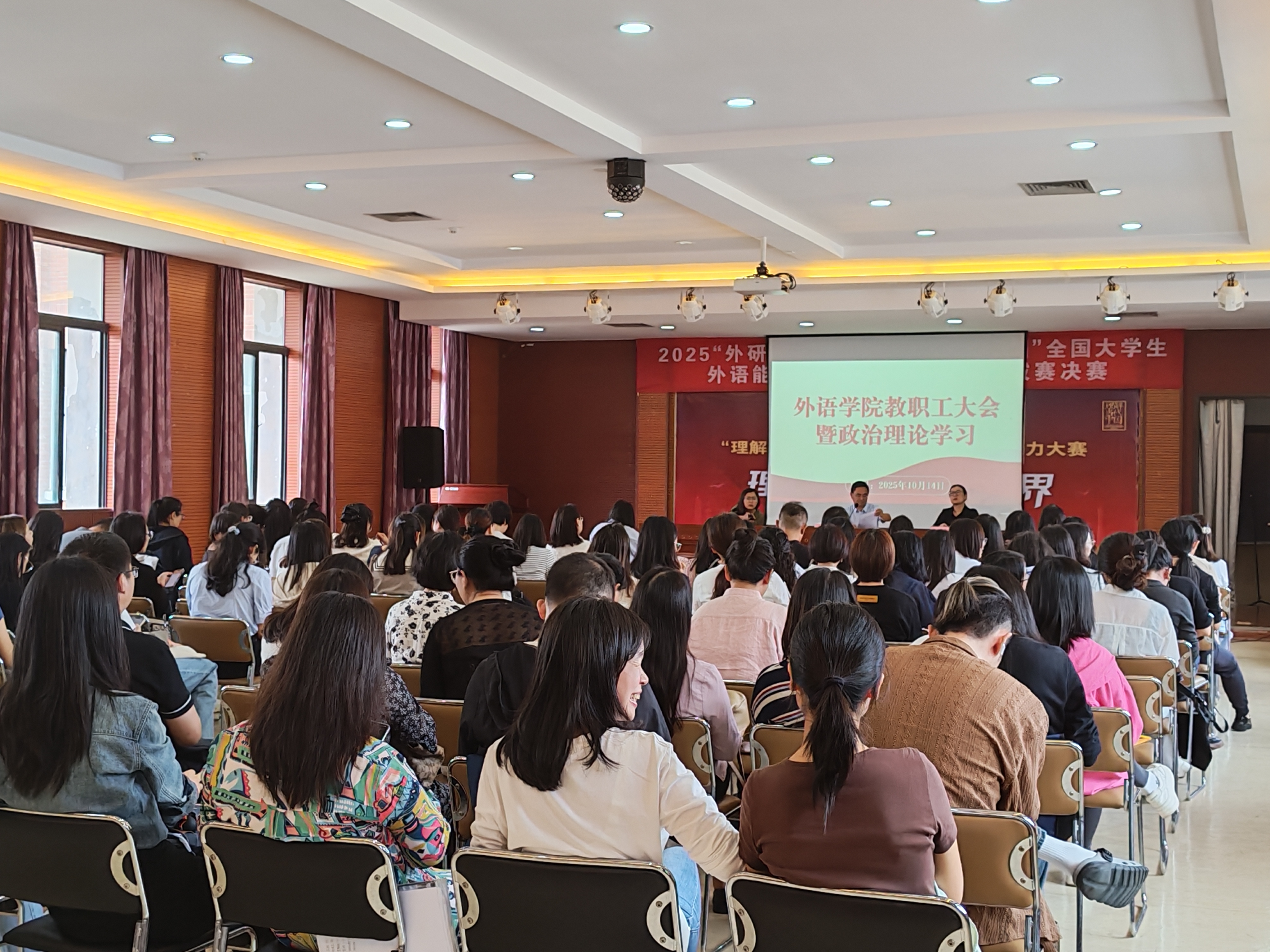 为持续深入学习贯彻习近平总书记在贵州考察时的重要讲话精神,以总体国家安全观为统领,牢牢掌握新时代高校意识形态和国防安全斗争主动权。2025年10月14日下午,外语学院在励学楼401会议室召开政治理论学习会。院党委书记黄贵平主持会议,全体教职工参加了会议。