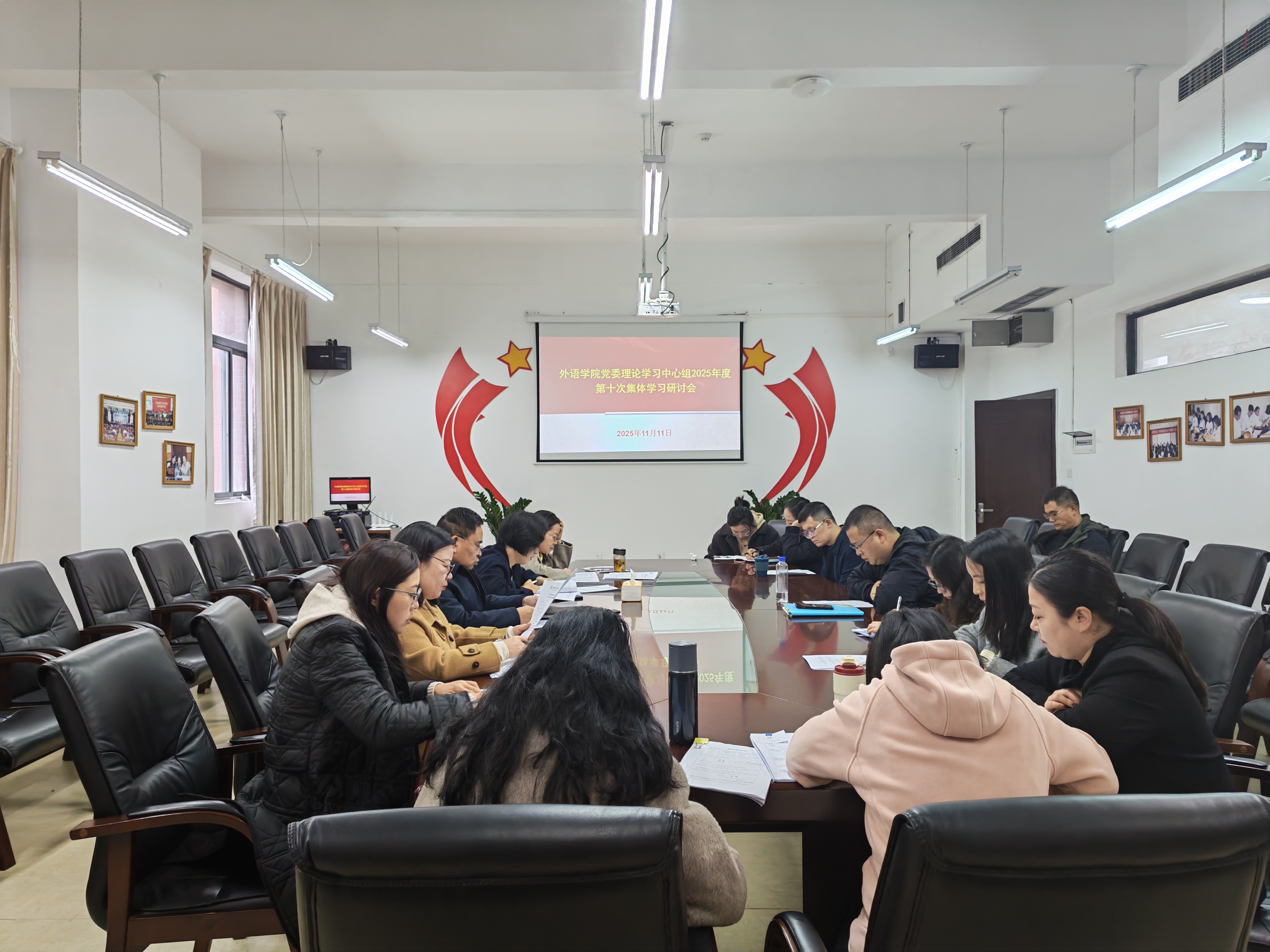 为深入学习贯彻党的二十届四中全会精神,切实把学院师生的思想和行动,统一到党中央的决策部署上来,11月11日上午,外语学院党委理论学习中心组2025年度第十次集体学习(扩大)研讨会在励学楼301会议室召开,专题学习党的二十届四中全会精神。院领导、党支部书记、科级干部及系部主任出席会议,会议由院党委书记黄贵平主持。
